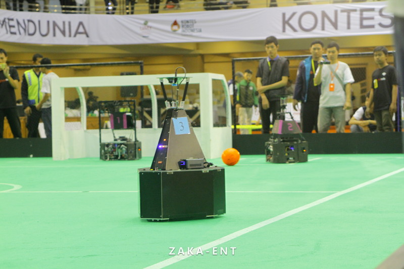 Yogyakarta, pens.ac.id – Masih di Sportorium Universitas Muhammadiyah Yogyakarta (UMY) tengah berlangsung putaran ketiga Kontes Robot Sepak Bola Indonesia (KRSBI) beroda. Menempati urutan kedua, ERSOW robot asal Politeknik Elektronika Negeri Surabaya (PENS) berhadapan dengan Polb3ng Tech asal Politeknik Negeri Bengkalis. Setelah sebelumnya unggul melawan SI-HATOP dari Universitas Sumatera Utara.