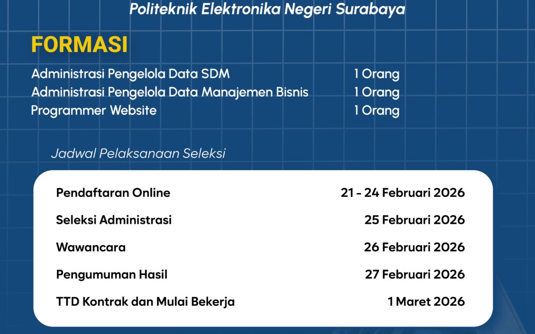 Politeknik Elektronika Negeri Surabaya (PENS) membuka kesempatan kepada Warga Negara Indonesia yang memiliki kompetensi, dedikasi, dan integritas tinggi untuk bergabung sebagai Penyedia Jasa Lainnya Perorangan (PJLP) guna mendukung kegiatan operasional dan akademik di lingkungan PENS.